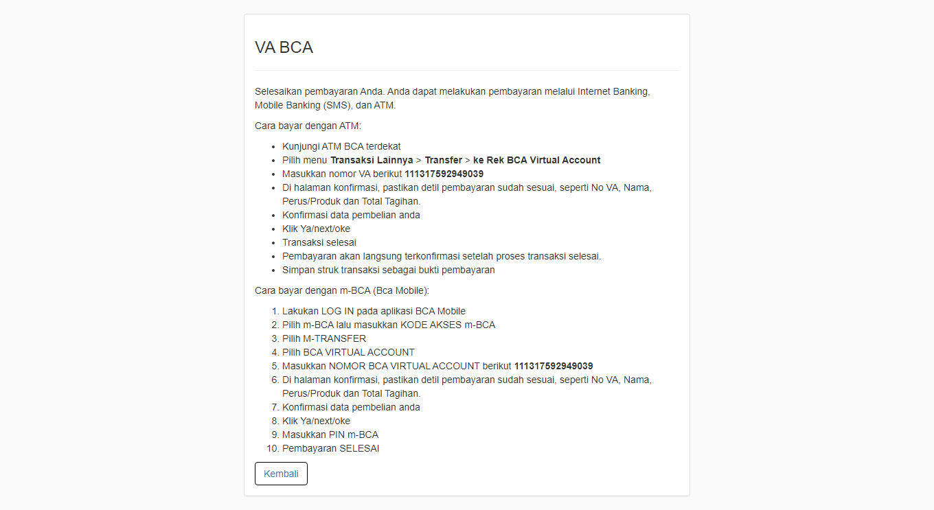 Akan terbuka halaman informasi pembayaran BCA Virtual Account, ikuti langkah langkah yang diberikan untuk melakukan pembayaran dengan Virtual Account BCA.