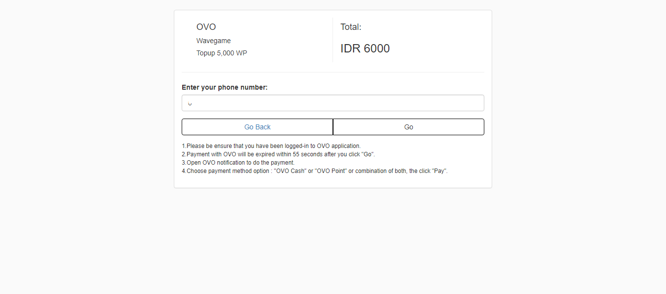 Akan terbuka halaman pembayaran OVO, masukkan nomor yang terkait dengan akun OVO kemudian klik "Go".