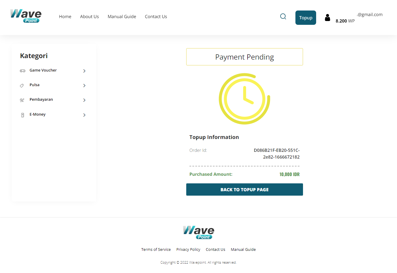 Anda dapat kembali ke halaman Topup, status transaksi akan pending dan dana akan masuk setelah pembayaran berhasil dilakukan